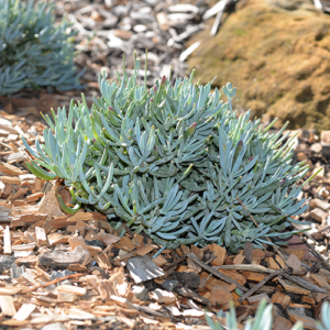 Succulents in the genus Senecio have daisy-like flowers on long stems. The leaves are generally thick and fleshy and they can be deep green, bluish, or even striped. The leaf shape can vary considerably including round, banana-shaped, and even pointed and trident shaped, like our Trident Blue variety.