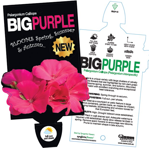Big Purple is an exciting NEW pelargonium that produces large clusters of purple flowers that are highlighted by rich dark green foliage.