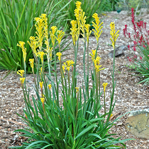 Its vivid yellow flowers contrast beautifully with the red-toned stems, creating a dazzling effect that makes it ideal as a feature plant in decorative pots or combined with other varieties in garden beds. The upright habit and reliable flowering make this kangaroo paw a favourite for both home gardeners and landscapers seeking year-round colour.