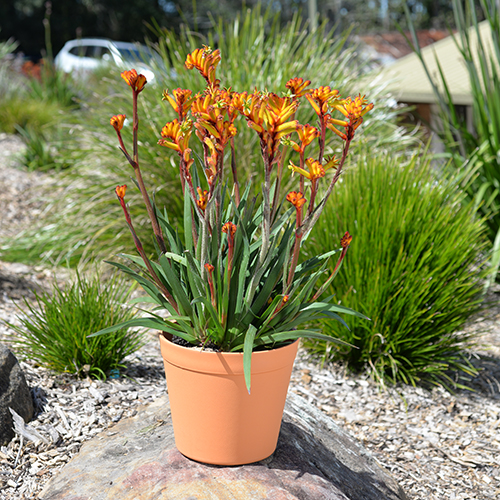Bush Fire will ignite the garden! From the Standard Bush Gems® range of kangaroo paws, Bush Fire produces an abundance of large, orange/gold flowers on tough, red stems.