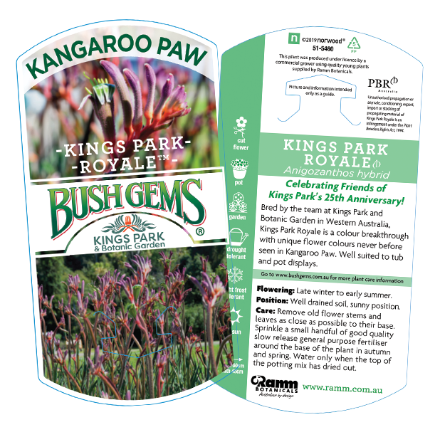 Celebrating Friends of Kings Park’s 25th Anniversary! Bred by the team at Kings Park Botanical Gardens, WA led by Digby Growns, Kings Park Royale is a colour breakthrough with the unique flower colours never before seen in kangaroo paw. Displaying tones of purple and red, this variety is well suited to feature in tubs and pots.