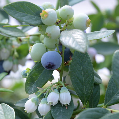 Edible and ornamental, Sunshine Blue is a compact rounded deciduous shrub with small, silvery green leaves that turn attractive shades of red and purple in autumn. In late spring, masses of pink flowers give way to multitudes of medium, sweet, dark blue berries. Sunshine Blue is an easy growing blueberry option as it has low chill requirements of only 150 hours and can tolerate acidic soils. Although self-fertile, cross-pollination helps to produce larger berries and larger yields.