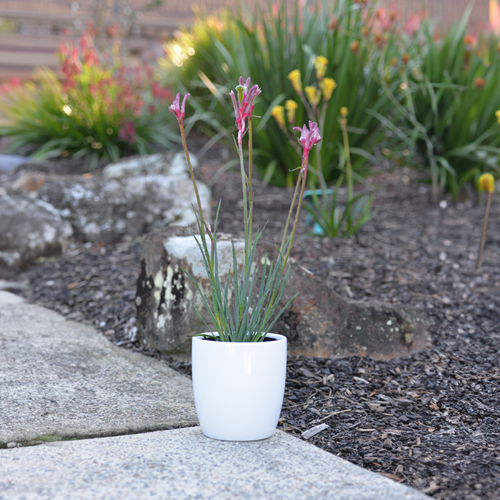 Bush Gems Celebrations® Anigozanthos ‘Valentine’ is a compact Australian kangaroo paw prized for its two tone pink, velvety flowers held on contrasting soft grey-green foliage.